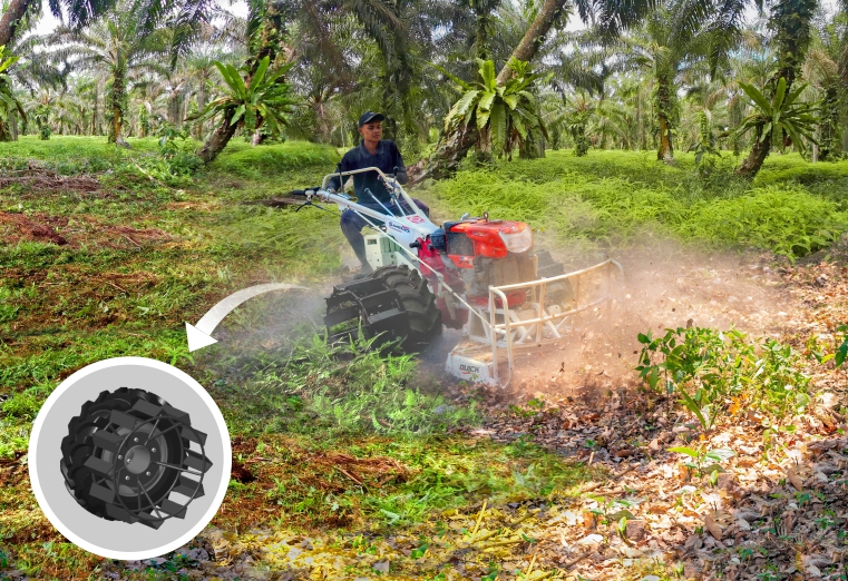 Dengan menggunakan single rear wheel, akan membuat Quick Amberjack Mower lebih lincah dalam mengolah lahan di piringan sawit
